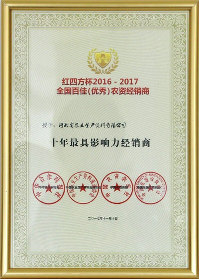 本网讯 近日,由中华合作时报、中国农业生产资料流通协会、中国东盟农资商会、中国农资传媒主办的“红四方杯2016-2017全国百佳(优秀)农资经销商”评选活动结果揭晓,按照公开、公平、公正的原则,经全国部分重点化肥生产企业、各级行业协会推荐、自荐、网络投票、报纸投票、专家评审、媒体公示等程序,我公司成功当选为“十年最具影响力经销商”。