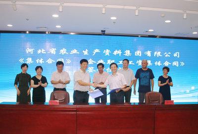 本网讯 8月2日上午,集团公司在农资大厦第一会议室举行《集体合同》、《工资集体合同》签订仪式,企业方与职工方协商代表、监督检查小组成员、劳动争议调解委员会成员、集团公司职工代表出席。双方首席代表,集团公司董事长、总经理李平现,集团公司工会主席郑占山分别代表企业方和职工方在《集体合同》、《工资集体合同》文本上签字。集团公司党委副书记彭国江主持。
