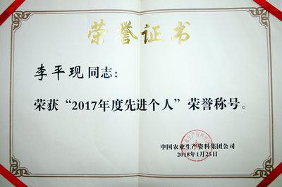 会议对中农集团2017年度4家先进集体和20名先进个人进行了表彰。我公司党委书记、总经理李平现荣获“2017年度先进个人”称号。