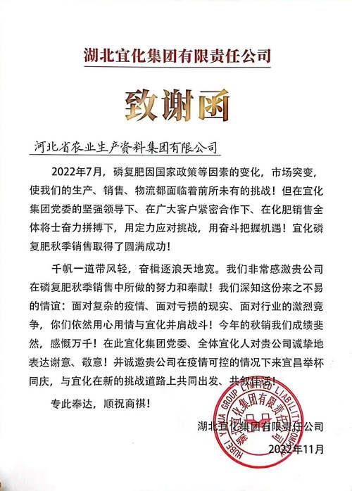 本网讯 近日,湖北宜化集团有限责任公司向集团公司发来致谢函,对双方良好的合作表示高度肯定,对集团公司在疫情和市场形势的双重压力下对湖北宜化的大力支持表示衷心地感谢。作为河北省农资流通领域的龙头企业,河北省农资集团今后将与湖北宜化集团进一步加强业务合作,深入拓展合作空间,强强联手,互利共赢,共同创造新的辉煌。