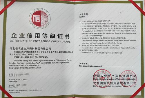 本网讯 近日,中国农资流通协会发布2022年度中国农资流通行业企业信用等级评价结果,河北省农资集团公司再度获评企业信用等级AAA级,属于行业信用评价最高等级。