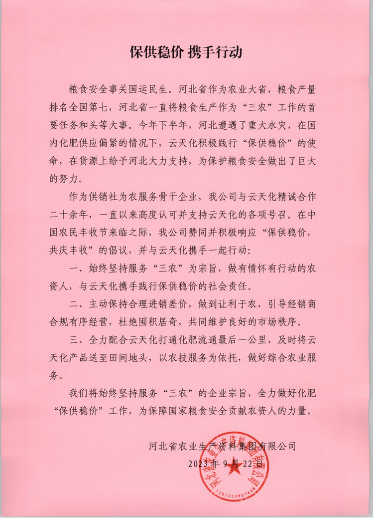 作为供销社为农服务骨干企业,我公司与云天化精诚合作二十余年,一直以来高度认可并支持云天化的各项号召。在中国农民丰收节来临之际,我公司赞同并积极响应“保供稳价,共庆丰收”的倡议,并与云天化携手一起行动,我们将始终坚持服务“三农”的企业宗旨,全力做好化肥“保供稳价”工作,为保障国家粮食安全贡献农资人的力量。