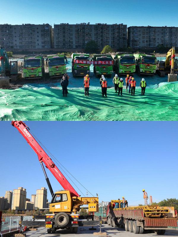 建设现场,机械引擎轰鸣,钻机高耸入云,运输车辆整齐划一,全员蓄势待发。