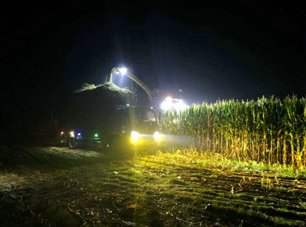 青贮作业地块大、时间紧,抢收同样面临挑战。为赶在雨歇窗口期完成抢收,丰安团队决定昼夜不息、连续作战,实行全天候轮班。刘佳天不亮就带头下地,刘磊、高朋、王继唯深夜在田间协调机械、清理地块,大家饿了就在田埂上扒几口盒饭,困了就在驾驶室里轮流眯一会儿,忙到凌晨三点结束工作。与此同时,王立威、张红同样全力以赴,从清晨6点持续奋战至次日凌晨2点,不停地过磅统计,收款调度,期间经手车辆达1000余辆,确保运输有序、账目清晰。